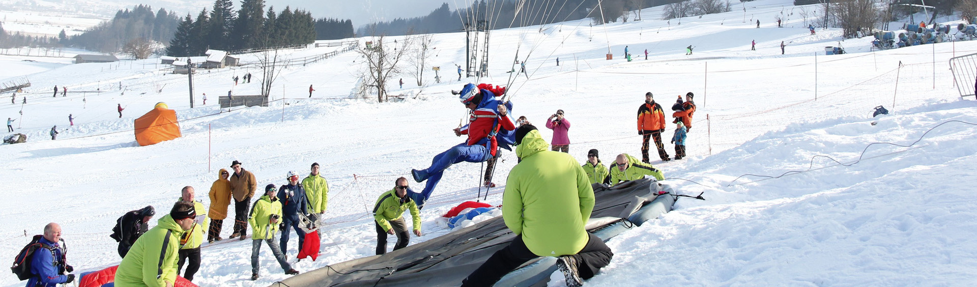 Parachute-Ski is an attractive skydiving discipline which generally takes place in ski resorts – however, the ski race can also be performed in ski halls..