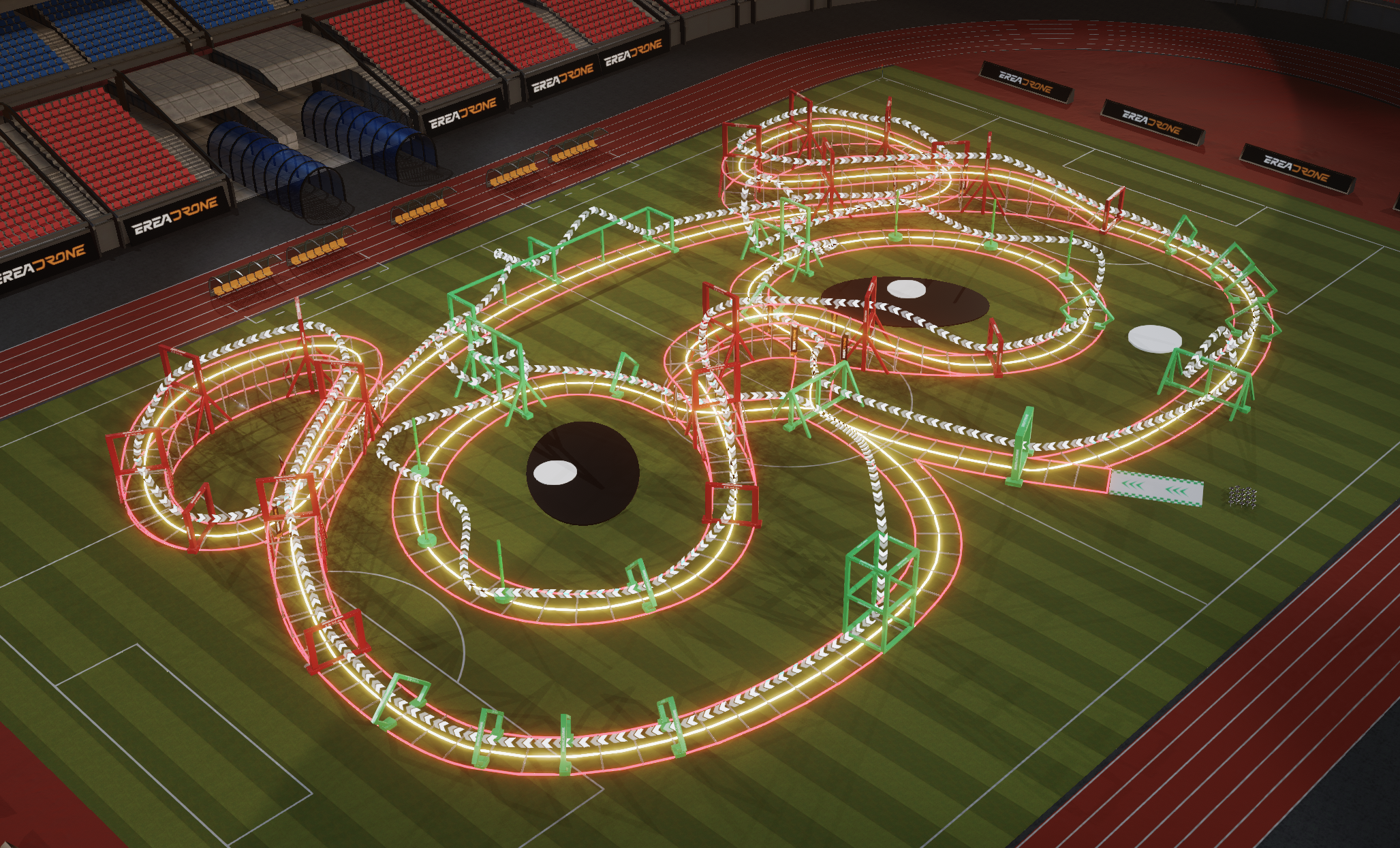Non-metallic materials will be used for the track including support structures and the gates/obstacles, such as composite impact-resistant plastic pipes, wooden materials (e.g., wooden boards), and high-density polystyrene materials. This aims to minimize video interferences on the drones. Track lighting will be done with dedicated flexible silicone outdoor waterproof 360-degree LED lighting materials of different colors.